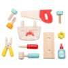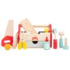 הארגז כולל 11 אביזרים: שקית בד, צבת, מברג, קרש עץ עם שני חורים, שני מסמרים, בריח, בורג, דבק עץ ופטיש.