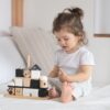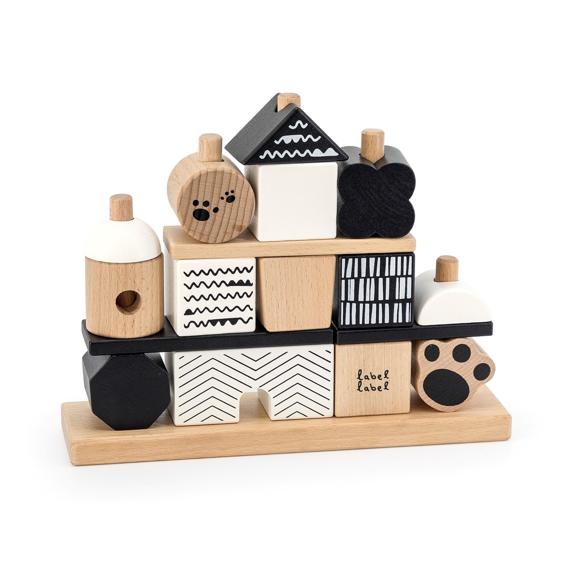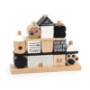 קוביות עץ בצורות שונות, בגווני שחור ולבן קלאסיים להרכבה של בית עץ כיד הדמיון