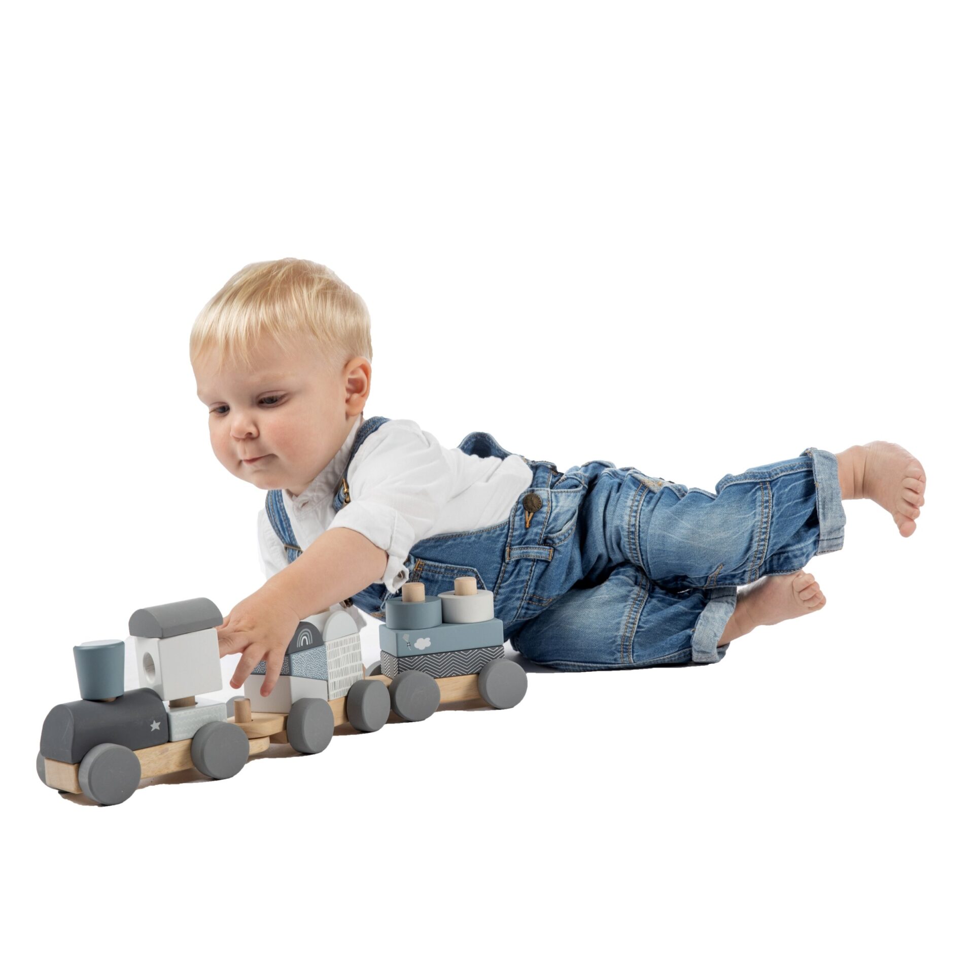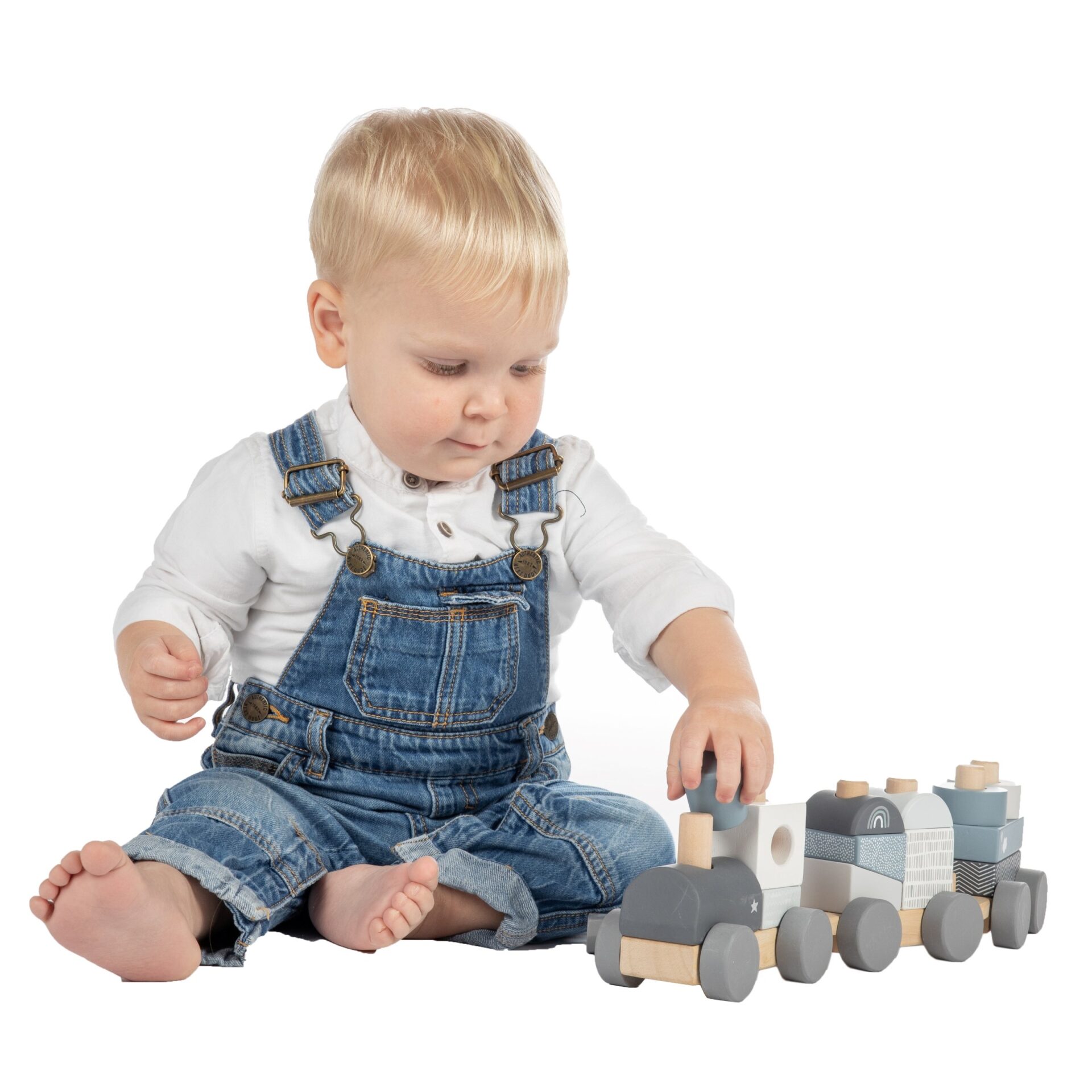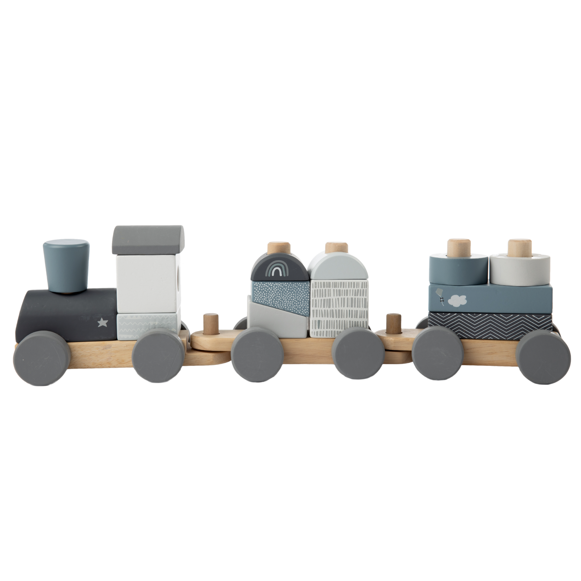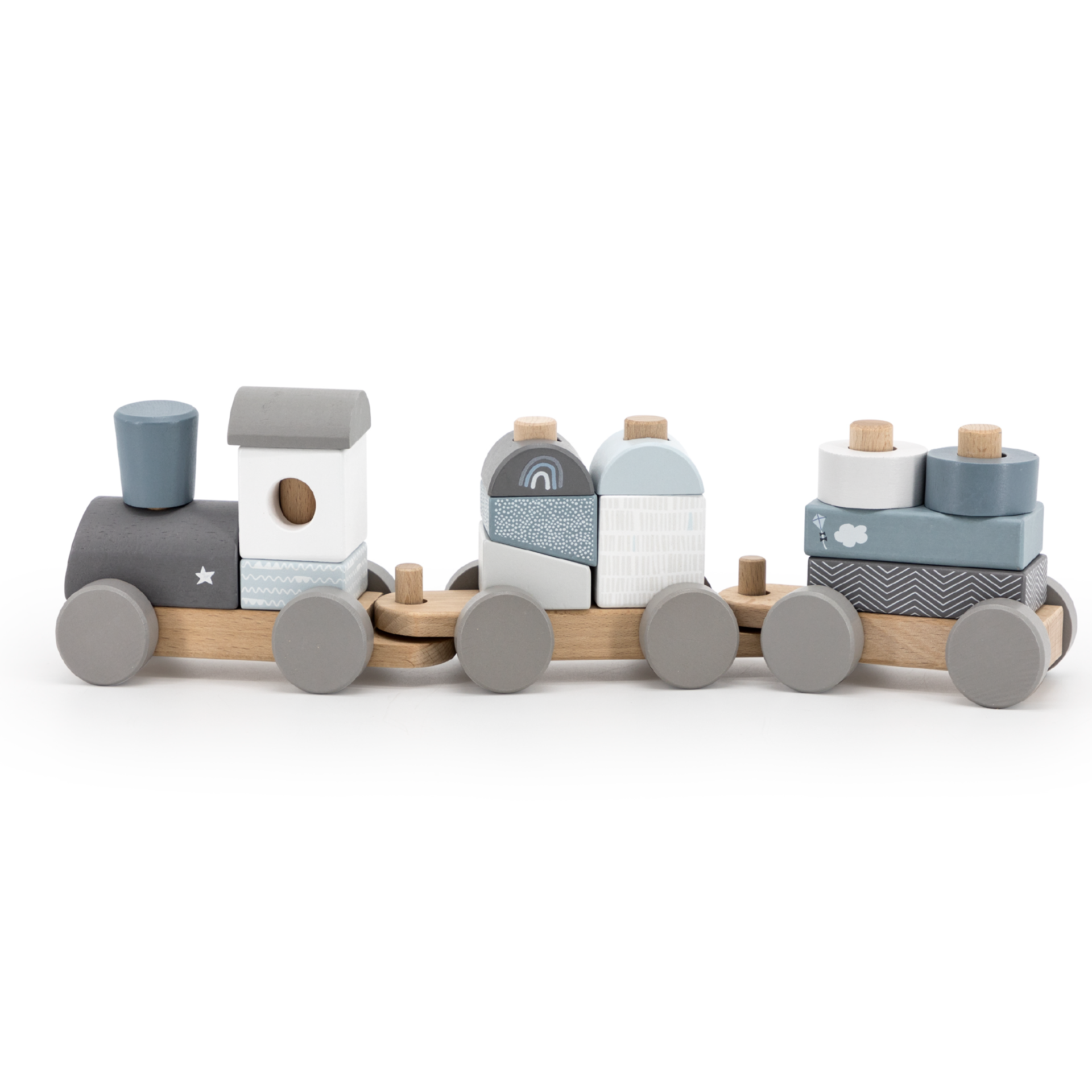 רכבת עץ מתוקה בצבעוניות פסטלית ונעימה, בנויה מקוביות המאפשרות מגוון אפשרויות בנייה ויצירתיות